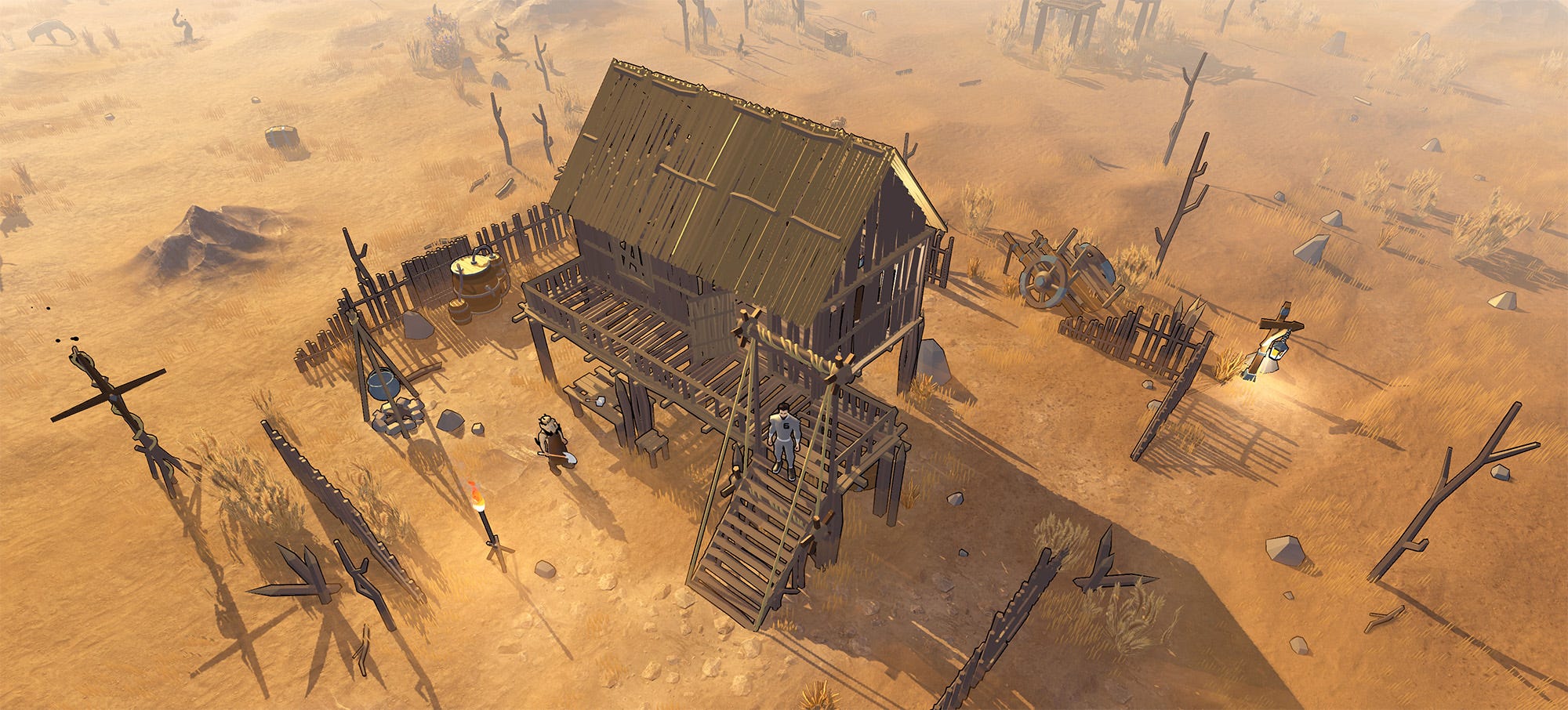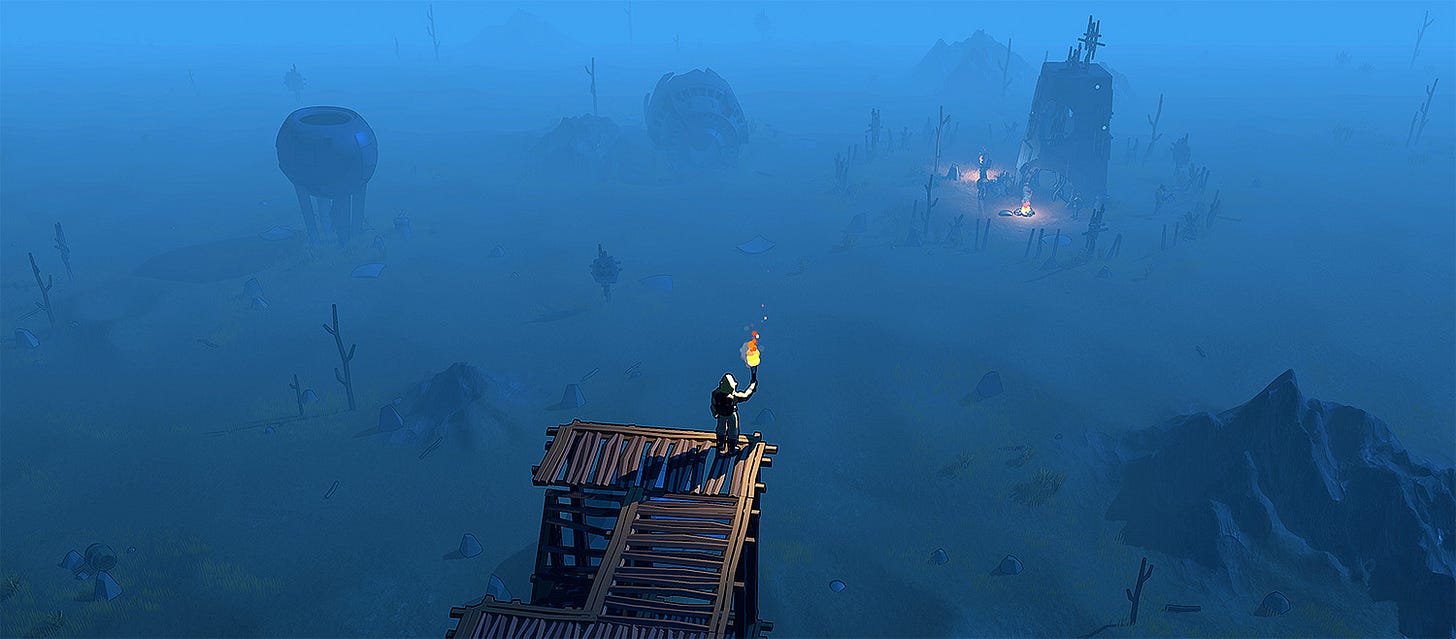 It all starts with a corporate starship crash, leaving the crew stranded on a harsh alien planet. Each night, the Rot rises from the ground — a mysterious phenomenon that destroys everything it can reach. To survive, the locals build Nightholds, or elevated shelters.